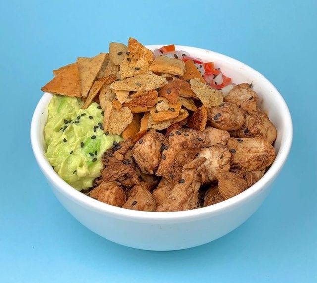 100gr de arroz integral, pollo en cubos al sillao, guacamole, pico de gallo, pitachips integrales.