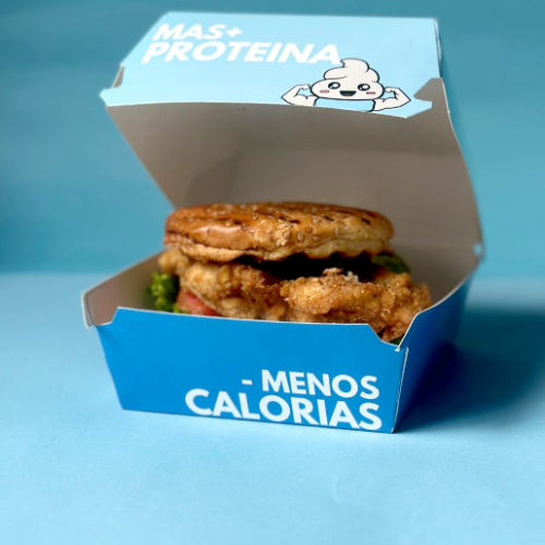Pan vegano a elección junto con un delicioso pollo crunch; rodajas de tomate; lechuga y cebolla acaramelizada acompañada de una salsa a elección.