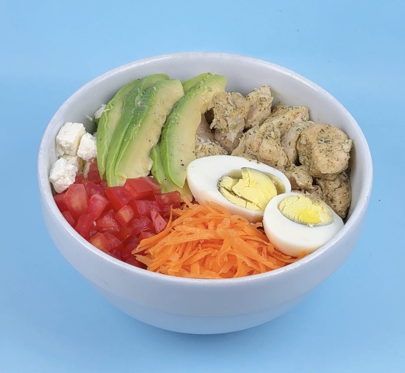 Nuestra ensalada de la casa, hecha a base de lechuga; palta; zanahoria; tomate; queso fresco light; huevo duro; pollo en cubos, acompañada de nuestra salsa de yogurt.