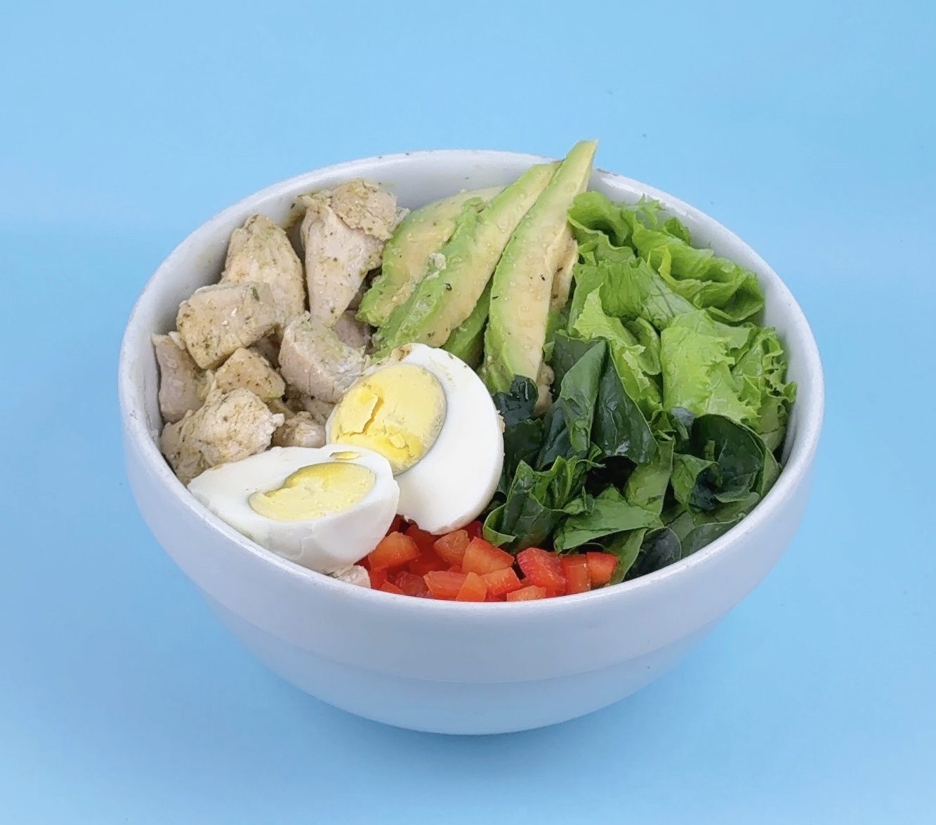 Deliciosa ensalada a base de 100gr de arroz integral; lechuga; espinaca; pimiento rojo; palta; huevo; pollo en cubos, acompañada de nuestra salsa de yogurt.